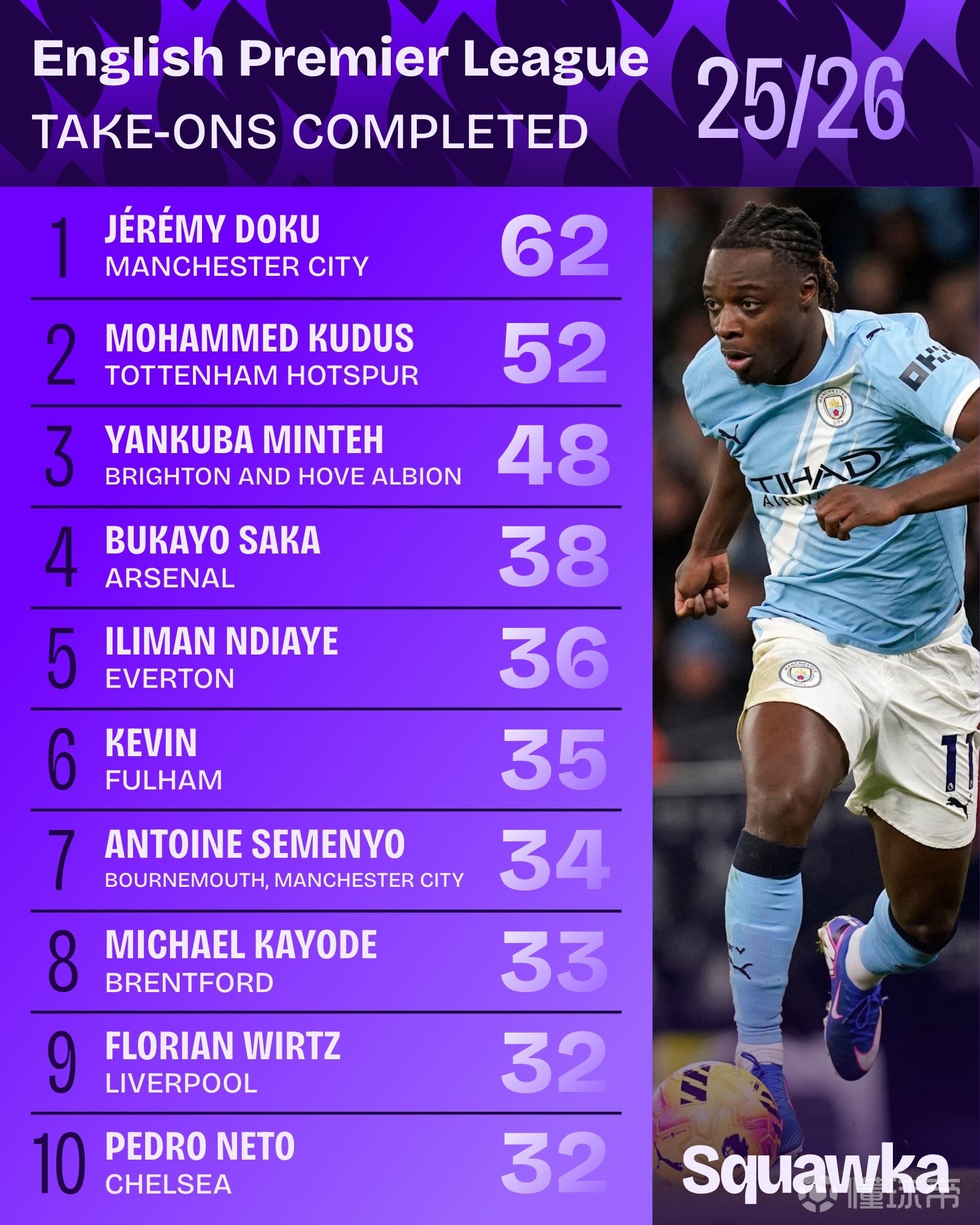 英超第23轮战罢,数据机构Squawka统计了本赛季英超成功过人数据,曼城边锋多库高居榜首。